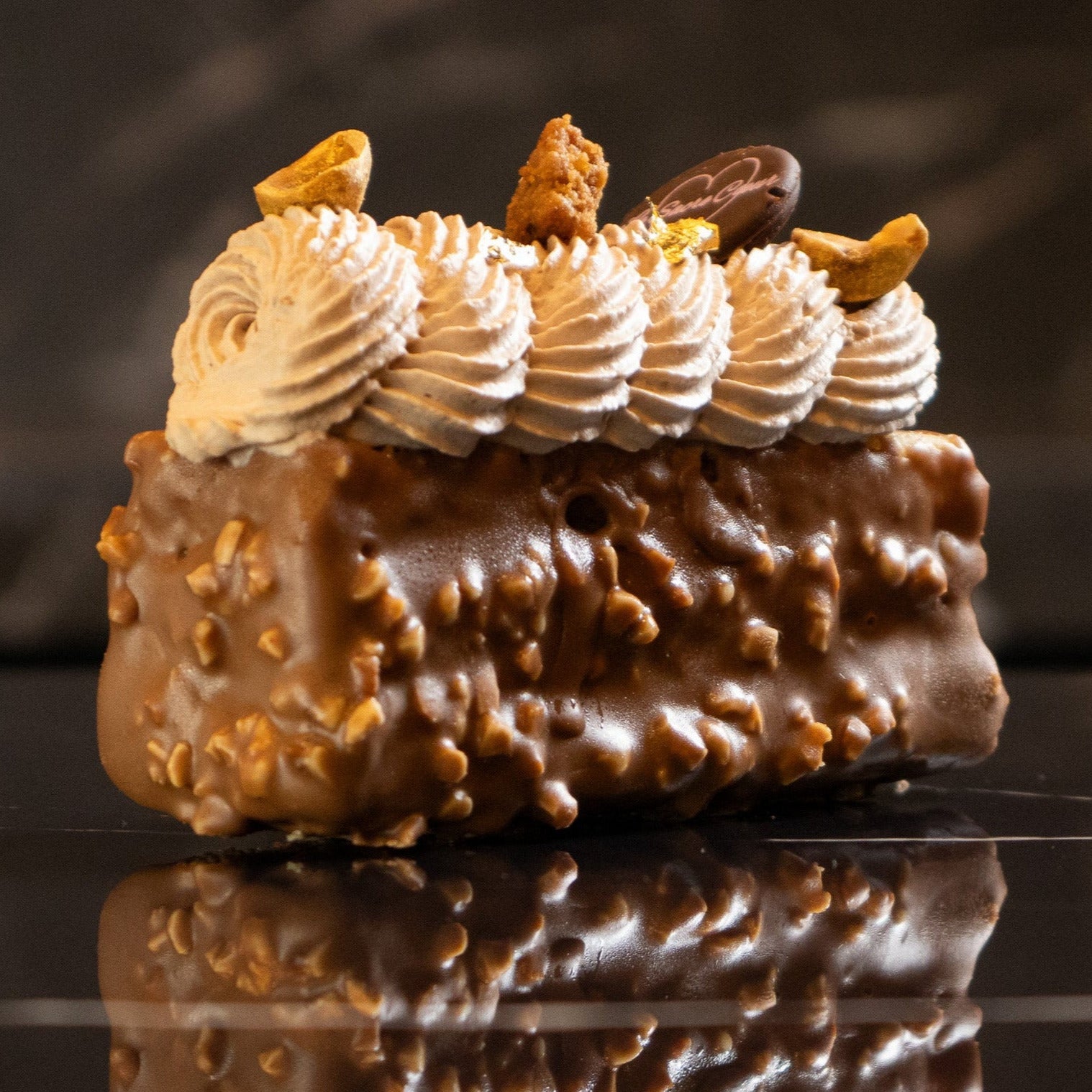 Esta compuesto de un bizcocho de avellana, un caramelo flor de sal y un crujiente de chocolate praline de avellana. Esta bañado en un glaseado goloso de choclate de leche con almendra tostada y decorado de una ganache montada de chocolate de leche y crumble de avellana.